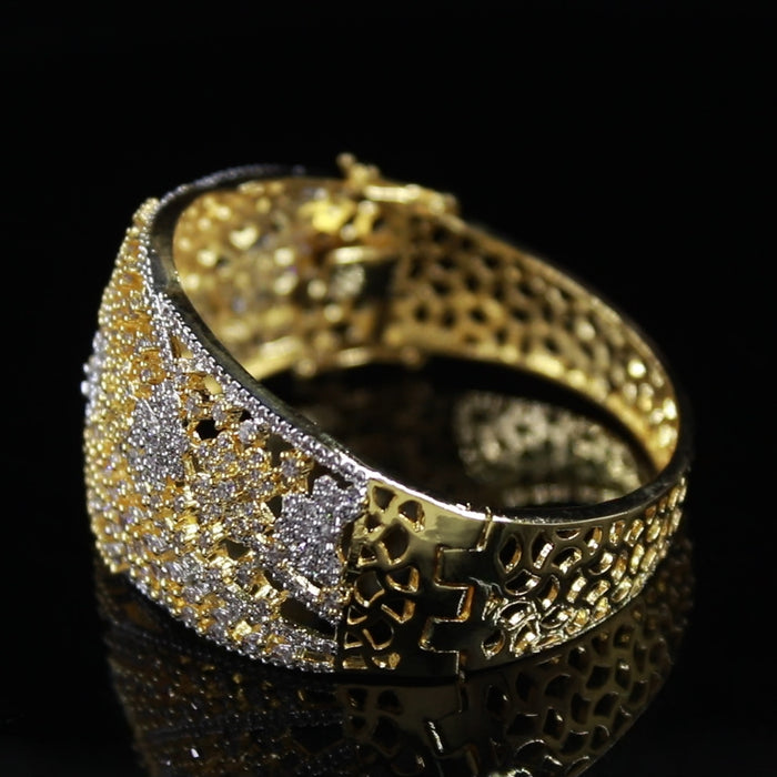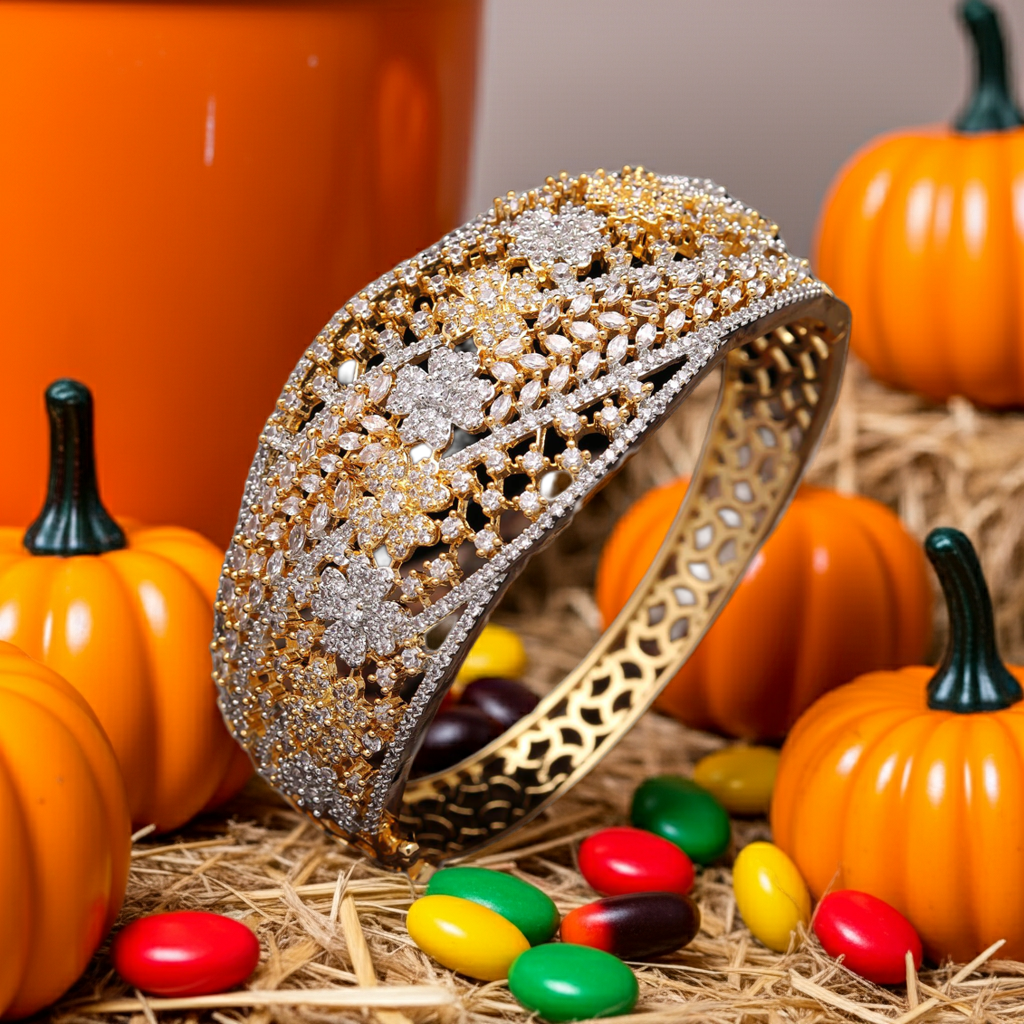 Add a touch of sophistication and brilliance to your ensemble with this Elegant Gold-Plated Floral Diamond-Cut Bangle. Crafted with intricate floral patterns and embellished with dazzling high-quality cubic zirconia stones, this bangle radiates grace and charm. Perfect for weddings, parties, festivals, or special occasions, it effortlessly elevates both traditional and modern outfits.