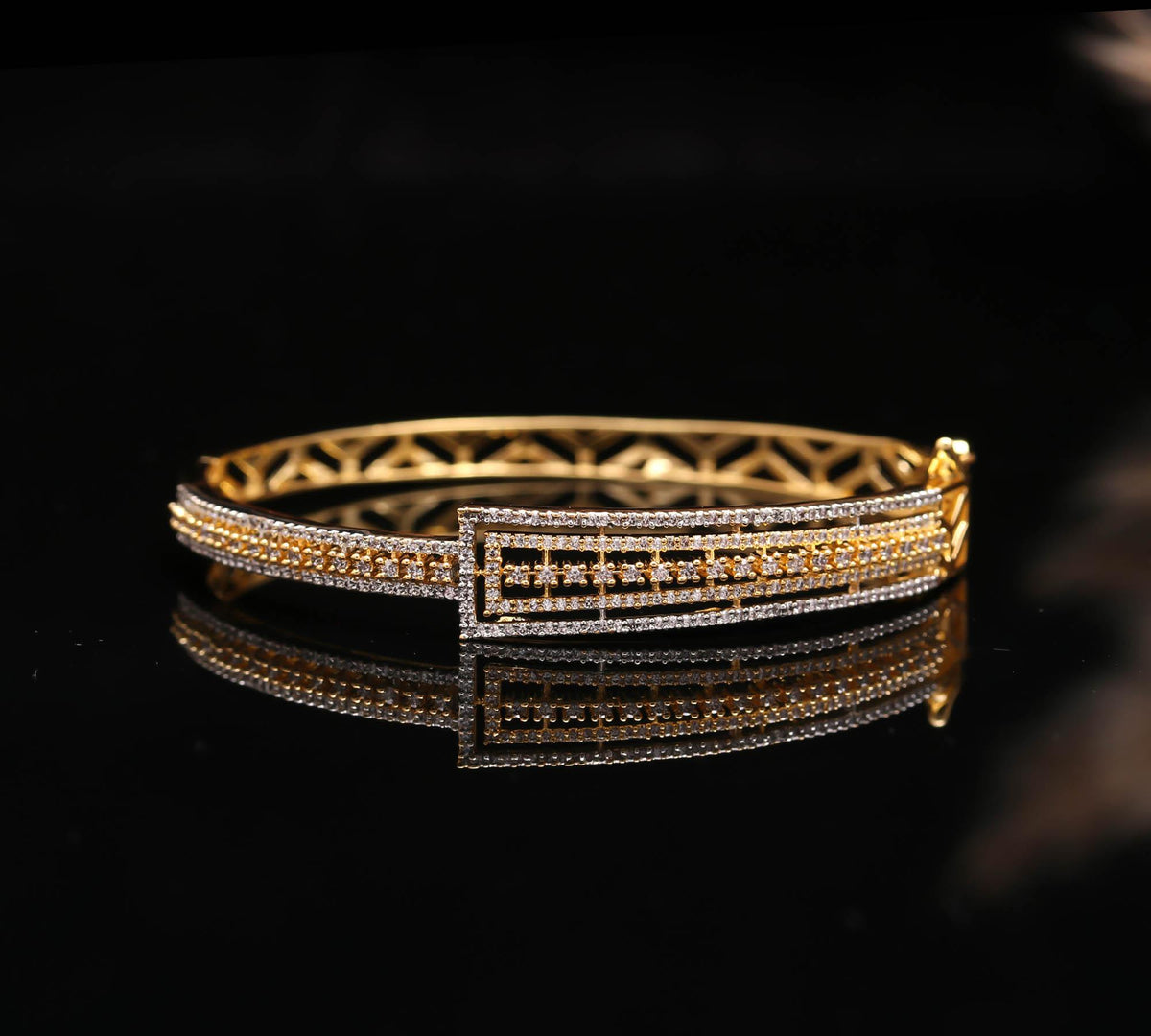 Dual-Textured Band: One half of the bangle features the same glittering Zircon stones, extending the sparkle around your wrist. The other half boasts an elegant cut-out pattern in rich gold-tone, adding depth and a modern artistic touch to the overall design. 🖼️