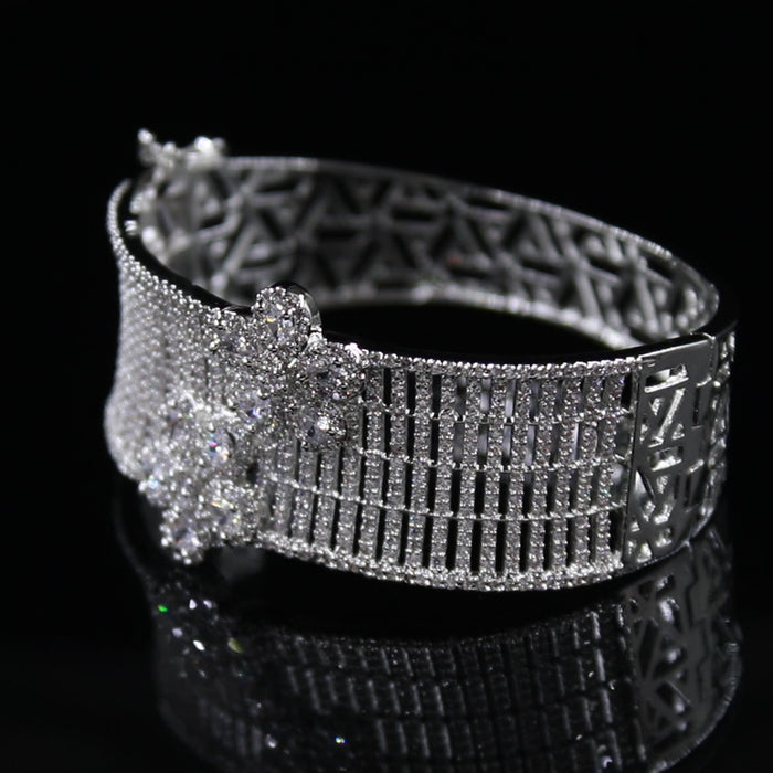 This bracelet features a dual-flower centerpiece crafted from sparkling CZ stones, arranged meticulously to create a delicate, feminine aura. The intricate grid-style band enhances the sparkle, giving the bracelet a bold yet refined appearance. Each crystal is hand-set for maximum light reflection, ensuring that every movement of your wrist catches the eye.
