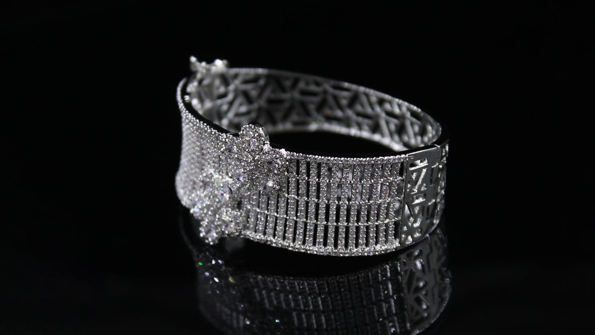 Add a touch of glamour to your look with this Elegant Silver Floral Diamond Bangle, designed for women who love to shine with sophistication. Adorned with premium Cubic Zirconia (CZ) stones, this luxury bracelet captures the brilliance of real diamonds — making it the perfect statement piece for any special occasion.