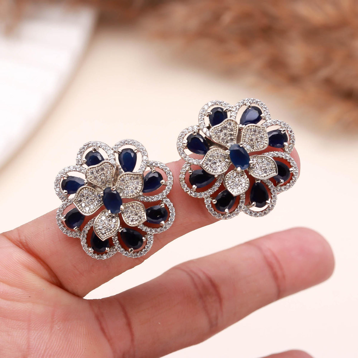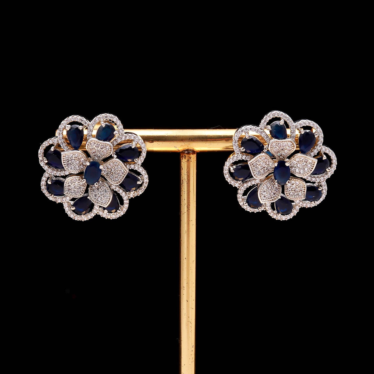 Luxury for everyday wear! Introducing these absolutely beautiful Sapphire Blue and White American Diamond (AD) Floral Stud Earrings, designed to give your ears an alluring, blossom-like appearance.