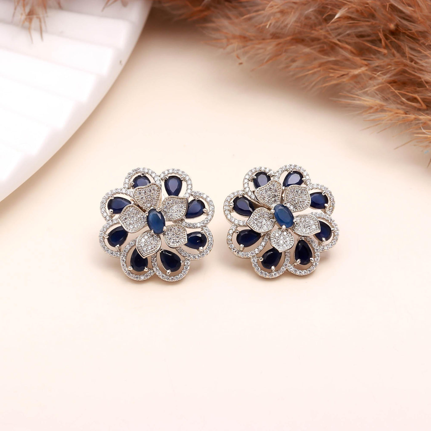 American Diamond (AD) Floral Stud Earrings | Multi-Color Options - Blue