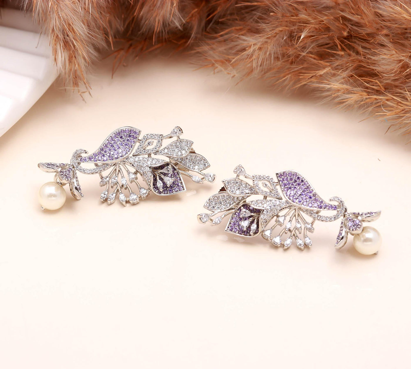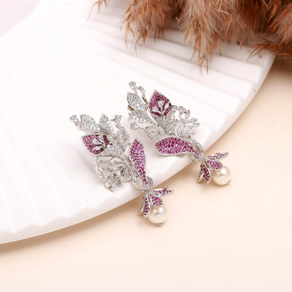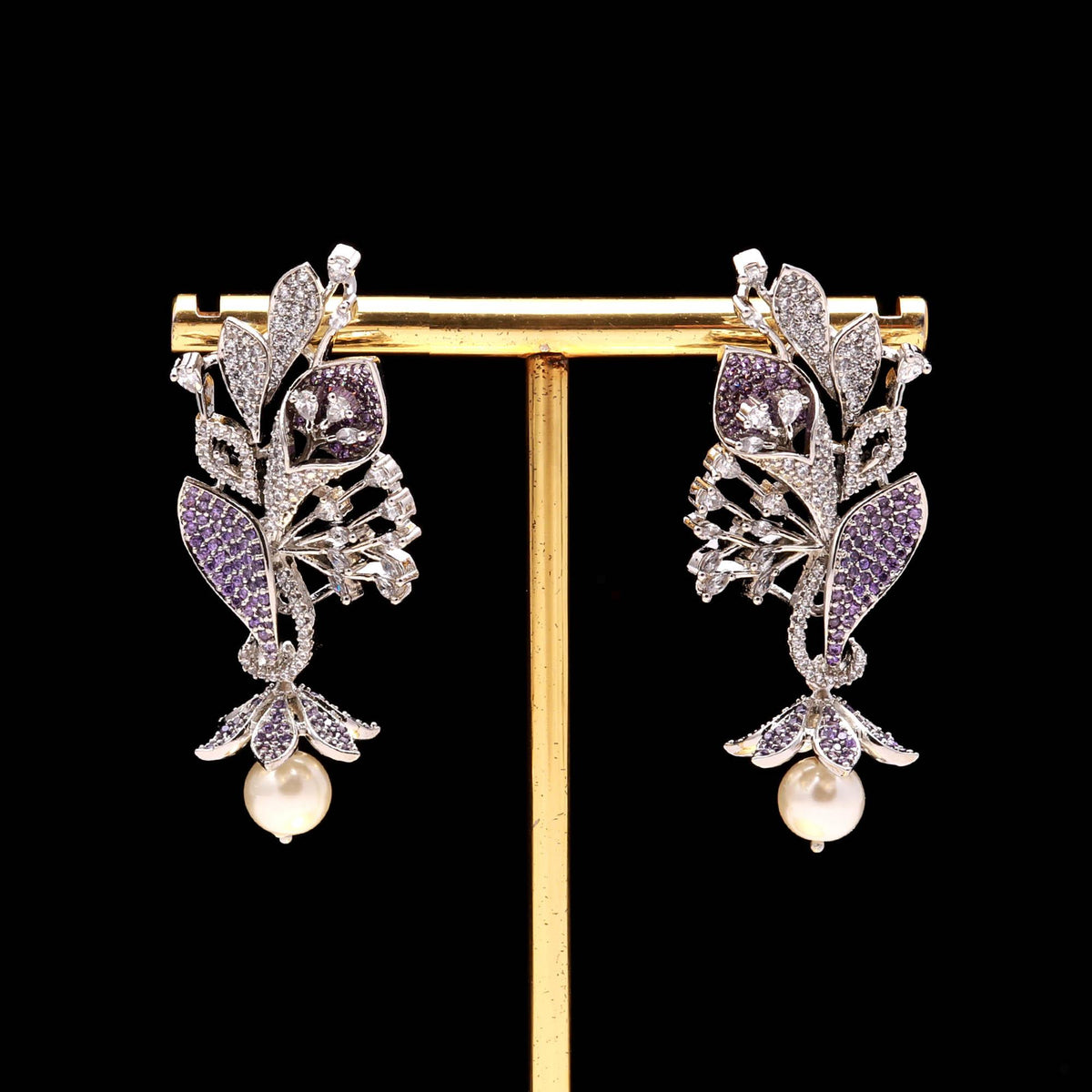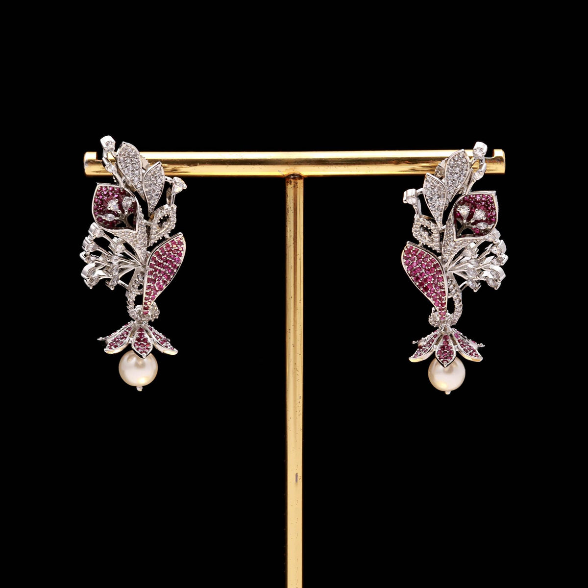 These earrings are beautifully crafted in an intricate, vertical Floral and Leaf pattern. The strategic use of Black and White AD stones creates a dazzling and high-contrast visual spectacle. Enhancing the design's elegance, a sophisticated Simulated Pearl dangles gracefully at the bottom, adding a touch of classic charm.