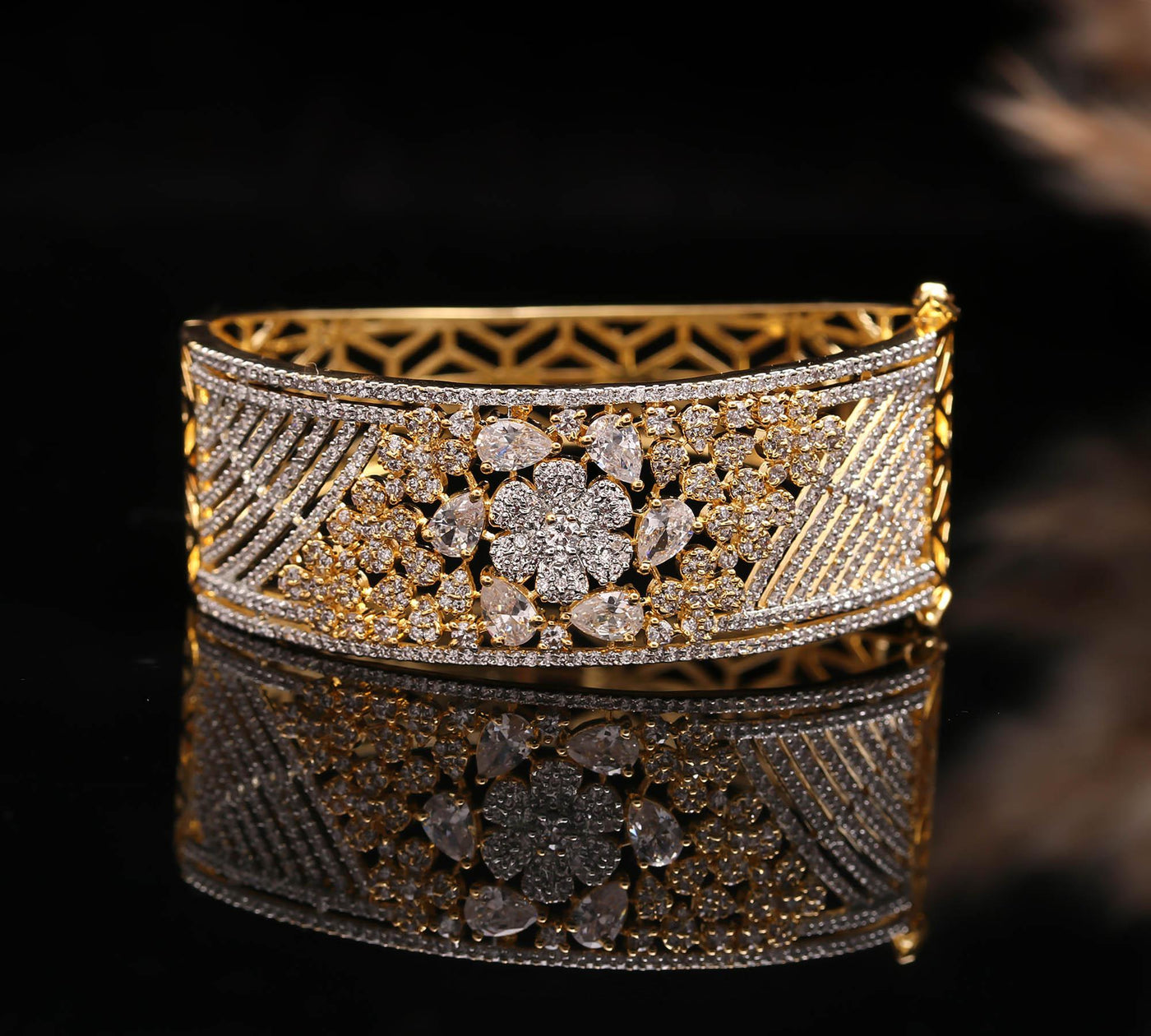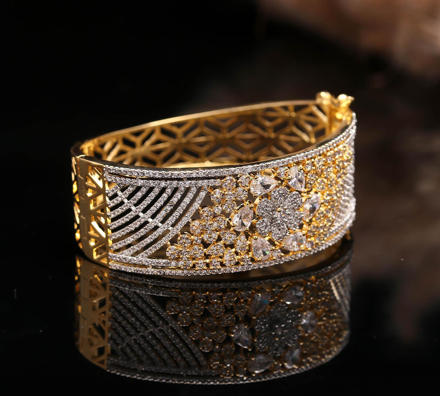 Meticulously crafted with high-polish gold and encrusted with sparkling diamonds, this designer bracelet is the perfect blend of modern grace and traditional charm. Whether you're dressing for a wedding, festive celebration, or a special evening out, this bracelet makes a bold and elegant statement.