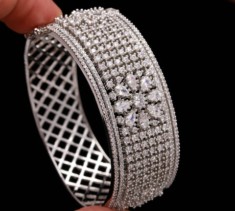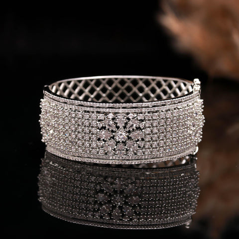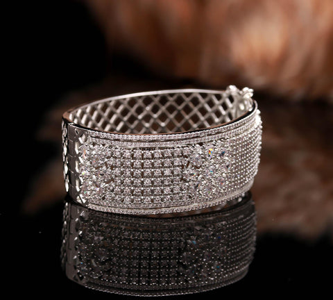 Dazzle with sophistication every time you wear this Luxury Silver Diamond Bangle, a masterpiece designed for women who adore brilliance and style. Meticulously crafted with precision-cut Cubic Zirconia (CZ) stones, this bracelet radiates the same sparkle as real diamonds — offering you luxury without the high cost. Whether it’s a wedding, engagement, anniversary, or evening party, this bracelet enhances your charm with a graceful, royal touch.