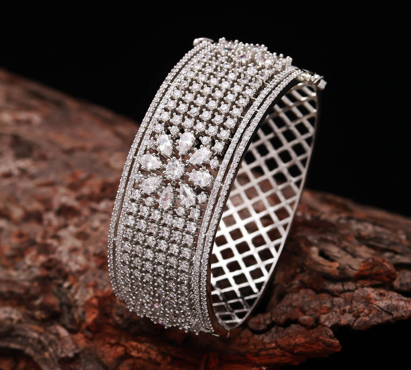 This stunning bracelet features an intricate floral pattern at the center, surrounded by hundreds of sparkling CZ crystals perfectly aligned to reflect light from every angle. The premium rhodium plating ensures long-lasting shine and tarnish resistance, keeping your bracelet looking brand new for years. The comfortable lattice inner design provides breathability and a perfect wrist fit, making it suitable for all-day wear.